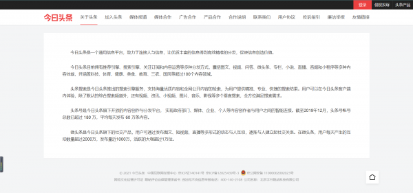 “你關(guān)心的,才是頭條”是今日頭條平臺(tái)的廣告語,今日頭條平臺(tái)是張一鳴先生于2012你那推出的一款個(gè)性化推薦引擎軟件,它能夠?yàn)槠脚_(tái)的用戶提供最有價(jià)值的各種信息。如圖所示是進(jìn)同日頭條官網(wǎng)對(duì)自己平臺(tái)介紹的部分內(nèi)容: