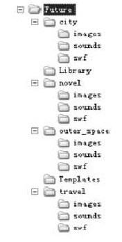 其中,Future為站 點的根文件夾,在根文件夾下根據(jù)網(wǎng)站不同的主題可分為“未來都市”、未來旅游(travel))、未來太空(outer space)、科幻小說(novel)等等欄目,每個欄目分別對應(yīng)不同的內(nèi)容。而每個主題所有文件均放在文件夾中,然后再進(jìn)一步地細(xì)分文件類型