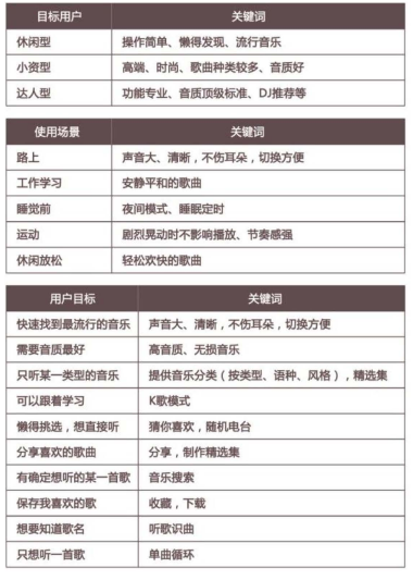 需要說明的是,休閑型、小資型、達(dá)人型用戶雖然有區(qū)別,但他們之間并不是絕對獨立和互斥的關(guān)系,他們的一些使用場景和用戶目標(biāo)甚至是重合的,比如休閑型和小資型用戶可能都有分享音樂的需求。因此在發(fā)散使用場景和用戶目標(biāo)時,不需要太受人群類型的限制。"放” 得越寬,“收”的時候才越有選擇余地,越不會遺漏重要內(nèi)容。
