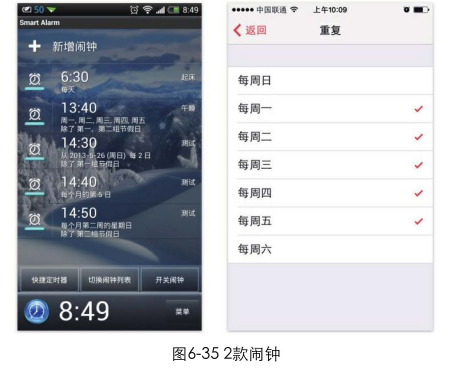 圖6-35所示為2款鬧鐘應(yīng)用。一款提供了非常強(qiáng)大的功能。在設(shè)置鬧鐘時(shí)可以有多種重復(fù)方式: 每天、每周的某些日子、每周的某些日子和第N組節(jié)假日、僅第N組節(jié)假日、每隔N 日、每月的某一日、每月第N周的某日,另一款只是簡(jiǎn)單地讓用戶選擇每周幾重復(fù)。如果是你,會(huì)喜歡哪款呢?