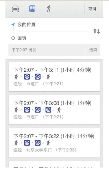 在Google Maps中,如果用戶想查詢路線,就一定要輸入起點(diǎn)和終點(diǎn),這是無(wú)法省略的過(guò)程。但是在查詢路線時(shí),Google Maps會(huì)利用定位功能自動(dòng)將起點(diǎn)定位為 “我的位置",減少用戶的操作,如圖6-36所示。