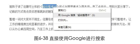 以前我們?cè)跒g覽網(wǎng)頁(yè)時(shí),看到一個(gè)想去了解更多的詞會(huì)怎么做呢? 我在一篇文章中看到一本書(shū),叫做《超級(jí)整理術(shù)》。我并不清楚這本書(shū)講了什么內(nèi)容,想去了解一下。于是我選中這幾個(gè)字,點(diǎn)擊鼠標(biāo)右鍵復(fù)制,在瀏覽器中新建個(gè)標(biāo)簽頁(yè),打開(kāi)Google,在搜索欄中右鍵粘貼,點(diǎn)擊"搜索”按鈕。經(jīng)過(guò)這一系列的操作之后,我終于在搜索結(jié)果頁(yè)中看到了關(guān)于這本書(shū)的簡(jiǎn)介、評(píng)價(jià)、購(gòu)買信息,等等。其實(shí)這整個(gè)過(guò)程也只是會(huì)耗費(fèi)幾十秒的時(shí)間,操作起來(lái)并不會(huì)覺(jué)得太難。直到有一天,我在使用Chrome瀏覽器的時(shí)候發(fā)在復(fù)制操作的下方,有一個(gè)"用Google搜索"XXX,"的選項(xiàng),只需點(diǎn)擊這一選項(xiàng),瀏覽器就會(huì)自動(dòng)彈出一個(gè)標(biāo)簽頁(yè),把我要的結(jié)果搜索出來(lái)。“選中-右鍵復(fù)制-新建窗口一打開(kāi)網(wǎng)站-粘貼-搜索" 這一復(fù)雜的過(guò)程就變成了"選中右鍵點(diǎn)擊Google搜索",只需2步,輕松完成任務(wù),如圖6-38所示。