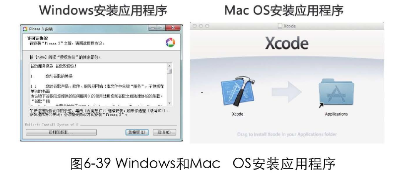 想想安裝應(yīng)用程序時(shí)Windows系統(tǒng)是怎么做的? 讓你去閱讀安裝許可協(xié)議,選擇安裝在哪個(gè)盤(pán)中,不停地點(diǎn)擊下步,還有很多高級(jí)選項(xiàng)讓你去琢磨和修改。而在Mac OS系統(tǒng)下,用戶僅需要簡(jiǎn)單地拖拽,將應(yīng)用圖標(biāo)拖到Application文件夾中即可完成應(yīng)用程序的安裝。也許沒(méi)用過(guò)MacIOS的朋友永遠(yuǎn)都不會(huì)覺(jué)得在Windows中安裝軟件是件很麻煩的事,因?yàn)橐呀?jīng)習(xí)以為常了。但一旦用過(guò)這種簡(jiǎn)單直接的安裝方式,便會(huì)由衷喜歡上它,如圖6-39所示。
