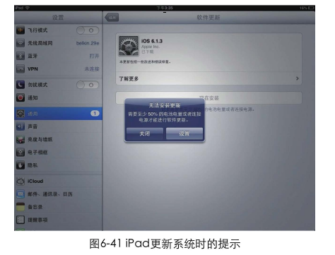iPad在更新系統(tǒng)時(shí),會(huì)提前檢測(cè)用戶的電量。如果電量不足以支撐完成更新,會(huì)提示用戶將iPod插上電源再來(lái)更新。試想一下,如果沒(méi)有這個(gè)提醒會(huì)怎樣呢? 用戶花費(fèi)了大量的時(shí)間下載更新,在安裝到一半時(shí)卻因?yàn)闆](méi)電而關(guān)機(jī)了 !用戶需要連接電源再次重新更新,更新的過(guò)程雖然沒(méi)有冗余步驟,但因?yàn)槿鄙兕A(yù)先提示而導(dǎo)致的重復(fù)操作也會(huì)使操作流程變復(fù)雜,如圖6-41所示。