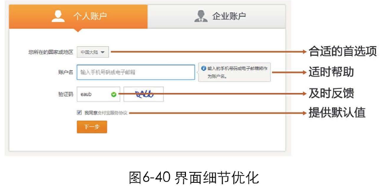 提供合適的首選項(xiàng)、適時(shí)幫助、及時(shí)反饋、提供合理的默認(rèn)值,等等,這些細(xì)節(jié)的優(yōu)化,可以幫助用戶降低出錯(cuò)幾率,使他們能夠更快、更順暢地完成任務(wù),如圖6-40所示。
