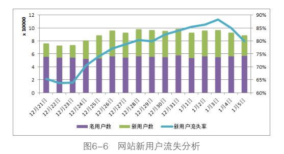 例如,網(wǎng)站的推廣部門有個(gè)需求:網(wǎng)站在年底的圣誕和元旦雙節(jié)日(12月24日到1月3日,為期11天)針對(duì)新用戶做了一個(gè)促銷推廣活動(dòng),活動(dòng)期限內(nèi)新注冊(cè)用戶可以免費(fèi)領(lǐng)取20元的現(xiàn)金抵價(jià)券,在3天有效期內(nèi)購(gòu)買任意商品時(shí)都可以使用,需要分析這次活動(dòng)為網(wǎng)站用戶數(shù)的增長(zhǎng)所帶來的效果。從活動(dòng)的內(nèi)容來看,活動(dòng)的主旨是帶動(dòng)網(wǎng)站新用戶的注冊(cè)和消費(fèi),為網(wǎng)站積累用戶數(shù),既然針對(duì)新用戶,可以對(duì)流失用戶做進(jìn)一步細(xì)分,分析活動(dòng)期間新用戶的流失情況,如圖6-6所示。