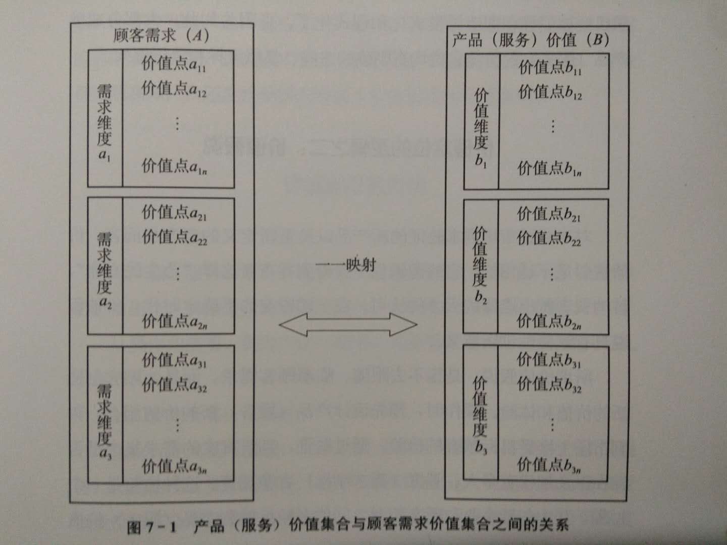 我們可以把顧客需求定義為A集合,產(chǎn)品(服務(wù))所提供的價(jià)值定義為B集合,A集合和B 集合中有多個(gè)元素--價(jià)值點(diǎn)。B集合中的每個(gè)價(jià)值點(diǎn)都是對(duì)A集合中每個(gè)價(jià)值點(diǎn)的體認(rèn)、理解、臨摹和追隨,顧客需求的價(jià)值點(diǎn)是產(chǎn)品(服務(wù))價(jià)值點(diǎn)的原象 價(jià)值定位基礎(chǔ)和依據(jù)),顯然,兩個(gè)集合之間存在一一映射的關(guān)系 (見(jiàn)圖7-1)。