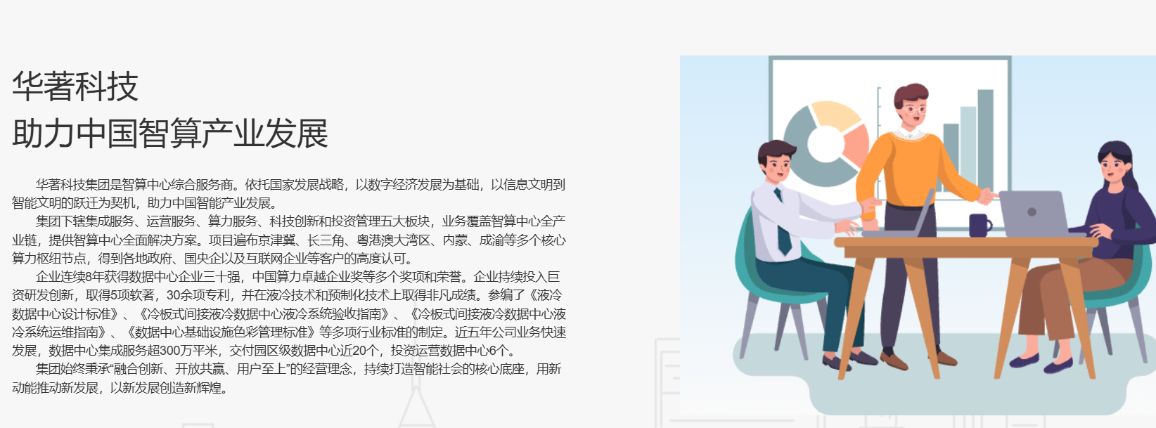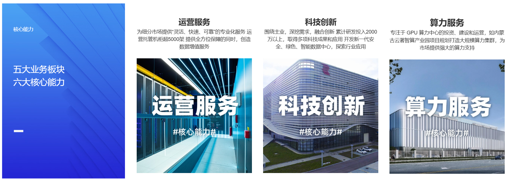集團下轄集成服務、運營服務、算力服務、科技創(chuàng)新和投資管理五大板塊,業(yè)務覆蓋智算中心全產(chǎn)業(yè)鏈,提供智算中心全面解決方案。項目遍布京津冀、長三角、粵港澳大灣區(qū)、內(nèi)蒙、成渝等多個核心算力樞紐節(jié)點,得到各地政府、國央企以及互聯(lián)網(wǎng)企業(yè)等客戶的高度認可。企業(yè)連續(xù)8年獲得數(shù)據(jù)中心企業(yè)三十強,中國算力卓越企業(yè)獎等多個獎項和榮譽。企業(yè)持續(xù)投入巨資研發(fā)創(chuàng)新,取得5項軟著,30余項專利,并在液冷技術和預制化技術上取得非凡成績。參編了《液冷數(shù)據(jù)中心設計標準》、《冷板式間接液冷數(shù)據(jù)中心液冷系統(tǒng)驗收指南》、《冷板式間接液冷數(shù)據(jù)中心液冷系統(tǒng)運維指南》、《數(shù)據(jù)中心基礎設施色彩管理標準》等多項行業(yè)標準的制定。近五年公司業(yè)務快速發(fā)展,數(shù)據(jù)中心集成服務超300萬平米,交付園區(qū)級數(shù)據(jù)中心近20個,投資運營數(shù)據(jù)中心6個。集團始終秉承“融合創(chuàng)新、開放共贏、用戶至上”的經(jīng)營理念,持續(xù)打造智能社會的核心底座,用新動能推動新發(fā)展,以新發(fā)展創(chuàng)造新輝煌。