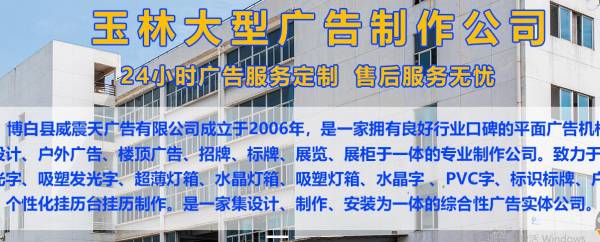 博白縣威*天廣告有限公司是一家技術(shù)先進(jìn)、實(shí)力雄厚,集廣告設(shè)計(jì)、戶外廣告、樓頂廣告、招牌、標(biāo)牌、展覽、展柜于一體的專業(yè)制作公司。致力于門頭LED發(fā)光字、吸塑發(fā)光字、超薄燈箱、水晶燈箱、吸塑燈箱、水晶字 、PVC字、標(biāo)識(shí)標(biāo)牌、戶內(nèi)外廣告、個(gè)性化掛歷臺(tái)掛歷制作。是一家集設(shè)計(jì)、制作、安裝,為一體的綜合性廣告公司。專業(yè)制作數(shù)碼寫真、噴繪、印刷彩業(yè)、海報(bào)、絲網(wǎng)印、條幅、錦旗、彩旗、綬帶、衣服印字、禮品印字、字牌、制度牌、胸牌、標(biāo)牌、廣告牌、樓牌、銅牌、鋁牌、門牌號(hào)、門頭、燈箱、金卡、銀卡、貴賓卡、會(huì)員卡、胸卡、展板、X展架、易拉寶、鈦金字、鐵皮字、水晶字、芙蓉字、發(fā)光字、LED霓虹燈、顯示屏、吸塑、拱門、墻體廣告發(fā)布、車體廣告發(fā)布等。 公司擁有大型的噴繪、寫真、橫幅、刻字、打印等專業(yè)廣告設(shè)備,作業(yè)面積達(dá)100多平米,交通便利。公司從創(chuàng)立至今,擁有豐富的經(jīng)驗(yàn),通過(guò)和各界客戶的合作,已形成一套自己的運(yùn)作方式。