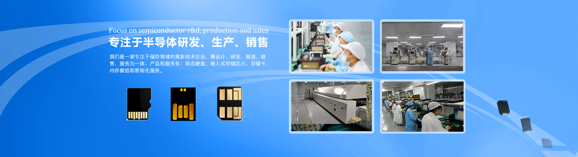 我們是一家專注于儲存領(lǐng)域的高新技術(shù)企業(yè),集設計、研發(fā)、制造、銷售、服務為一體;產(chǎn)品和服務有:固態(tài)硬盤、嵌入式存儲芯片、存儲卡、內(nèi)存模組和客制化服務。生產(chǎn)基地總投資 2 億元,生產(chǎn)工廠占地 28900 平米,擁有全球領(lǐng)先的 SiP 封裝工藝生產(chǎn)設備及測試設備 , 年產(chǎn)能 100KK。