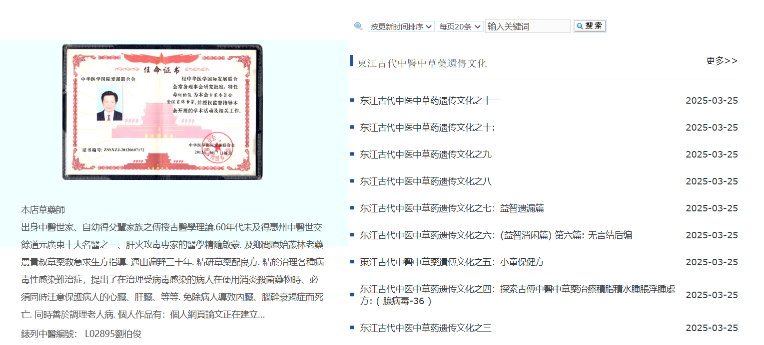 出身中醫(yī)世家、自幼得父輩家族之傳授古醫(yī)學(xué)理論.60年代未及得惠州中醫(yī)世交餘道元廣東十大名醫(yī)之一、肝火攻毒專家的醫(yī)學(xué)精隨啟蒙. 及鄉(xiāng)間原始叢林老藥農(nóng)貴叔草藥救急求生方指導(dǎo). 邁山遍野三十年. 精研草藥配良方. 精於治理各種病毒性感染難治癥 海洋網(wǎng)絡(luò)提供網(wǎng)站建設(shè)
