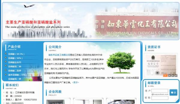 如東華*化工有限公司選用我司企業(yè)化工原料行業(yè)的網(wǎng)站優(yōu)化產(chǎn)品,其SEO關(guān)鍵詞有 亞磷酸,南通亞磷酸,如東亞磷酸,液體亞磷酸。其特點(diǎn)是用很合適的展示方式、展示效果、站點(diǎn)框架,把客戶及其用戶很關(guān)心的問(wèn)題突出表現(xiàn);并以簡(jiǎn)潔明朗的設(shè)計(jì)風(fēng)格,清晰展現(xiàn)公司水平實(shí)力,確保一秒抓住目標(biāo)用戶眼球,給用戶留下良好的第一印象。如東華*化工有限公司成立于2003年,是經(jīng)如東市市場(chǎng)監(jiān)督管理局審核的有資質(zhì)的公司,其統(tǒng)一社會(huì)信用代碼:91320623752**6411N。公司地址:江蘇省如東縣豐利鎮(zhèn)。