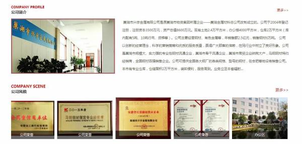 巢湖市*宇金屬有限公司選用我司企業(yè)金屬材料行業(yè)的網(wǎng)站優(yōu)化產(chǎn)品,其SEO關(guān)鍵詞有 巢湖市*宇金屬有限公司。其特點(diǎn)是用很合適的展示方式、展示效果、站點(diǎn)框架,把客戶及其用戶很關(guān)心的問題突出表現(xiàn);并以簡潔明朗的設(shè)計(jì)風(fēng)格,清晰展現(xiàn)公司水平實(shí)力,確保一秒抓住目標(biāo)用戶眼球,給用戶留下良好的第一印象。巢湖市*宇金屬有限公司成立于2004年,是經(jīng)巢湖市市場監(jiān)督管理局審核的有資質(zhì)的公司,其統(tǒng)一社會(huì)信用代碼:91340181756841**7B。公司地址:巢湖市向陽南路與亞父路交叉口居巢經(jīng)濟(jì)開發(fā)區(qū)金屬樓。