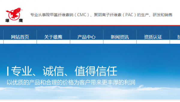 安丘市*鷹纖維素有限責任公司是由原安丘市纖維素廠組建而成,始建于一九八五年,是專業(yè)從事羧甲基纖維素鈉(CMC)、聚陰離子纖維素(PAC)的生產、研發(fā)和銷售的高新技術企業(yè);公司坐落于山東濰坊,現(xiàn)占地面積9萬多平方米, 年產羧甲基纖維素鈉25000噸和聚陰離子纖維素5000噸。公司主導產品“雄鷹”牌羧甲基纖維素鈉廣泛應用于食品、洗滌、石油、卷煙、造紙、陶瓷、印染、紡織、醫(yī)藥、焊接等工業(yè)。公司通過了 ISO9001質量管理體系認證、HACCP 食品安全管理體系認證,伊斯蘭HALAL 和 猶太KOSHER認證。自一九九五年以來,公司先后被安丘市委、市府評為"最佳經濟效益企業(yè)",被中國農業(yè)銀行濰坊市分行評為"AAA級信用企業(yè)",被國家農業(yè)部評為"全國質量管理達標企業(yè)"。一九九五年HPMC纖維素獲山東科技進步二等獎。二00六年十月,"雄鷹"被山東省宣傳部評為山東省民營企業(yè)知名品牌。二00七年,"雄鷹"商標,被評為山東省著名商標。公司主要市場分布于浙江、安徽、上海、四川、江蘇、山西、山東等省市,并出口東南亞,中東,非洲,歐洲,美洲,日韓等國家(地區(qū))。