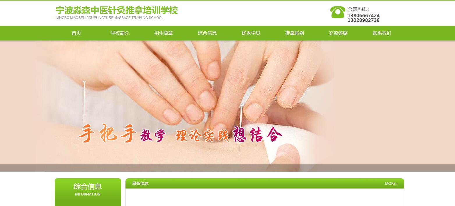 海洋網(wǎng)絡(luò)網(wǎng)站建設(shè)從2017年開(kāi)始與寧波淼森中醫(yī)針灸推拿培訓(xùn)學(xué)校深度合作,幫助寧波淼森中醫(yī)針灸推拿培訓(xùn)學(xué)校設(shè)計(jì)網(wǎng)站及開(kāi)發(fā)網(wǎng)站多次網(wǎng)站平臺(tái),此項(xiàng)目為2017年寧波淼森中醫(yī)針灸推拿培訓(xùn)學(xué)校新版官方網(wǎng)站。